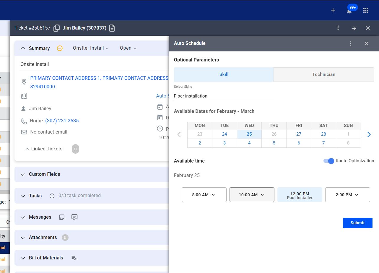 - Toggle Route Optimization to “On” to prioritize the technician closest to the job site.
